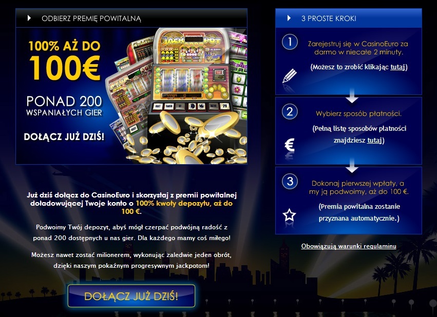 Aby zgarnąć bonus, wystarczy przelać pieniądze na konto w kasynie. Wartość przelewu zostanie podwojona automatycznie do kwoty 100€. To proste! Przelej 10€, a dostaniesz 10€ bonusu. Przelej 100€, a dostaniesz 100€ bonusu.